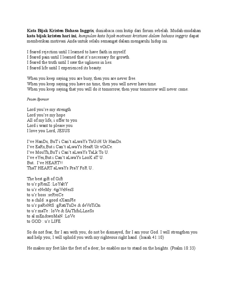 Sabar bukan berarti lambat ,bukan berarti juga hilang ketegasan , kesabaran adalah memilih waktu yang paling tepat untuk segera bertindak. Jika kamu tidak ingin dirasuki oleh cinta, maka cobalah bijak dan teliti dalam menyikapinya. We spend time searching for people who deserve to be loved, or finding fault with those we love. Di sini banyak contoh kata bijak dalam bahasa inggris dan artinya yang singkat tapi keren. Melayu sangat terkenal dengan kata kata mutiara, kata kata bijak ataupun nasehat yang dapat memotivasi.
